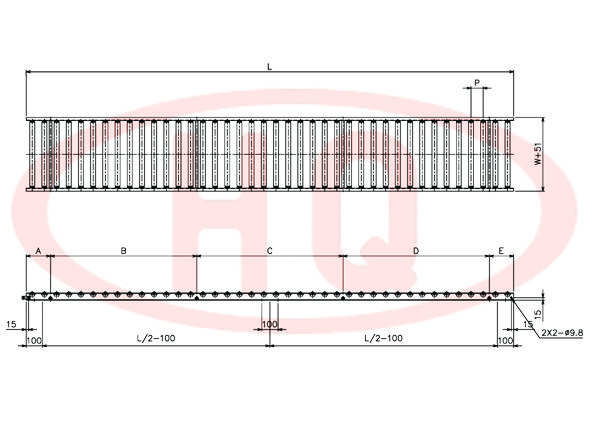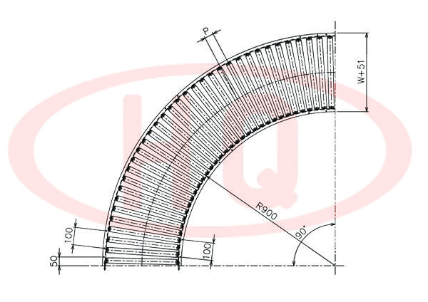| 型 號 | 滾筒外徑(φ)×壁厚(t) 軸承 | 軸外徑(φ)×壁厚(t) 加工 | 支架形狀I×K×t | 機 長 L | 滾筒幅寬 W | 滾筒間距 P | 轉彎半徑 R | |||||
